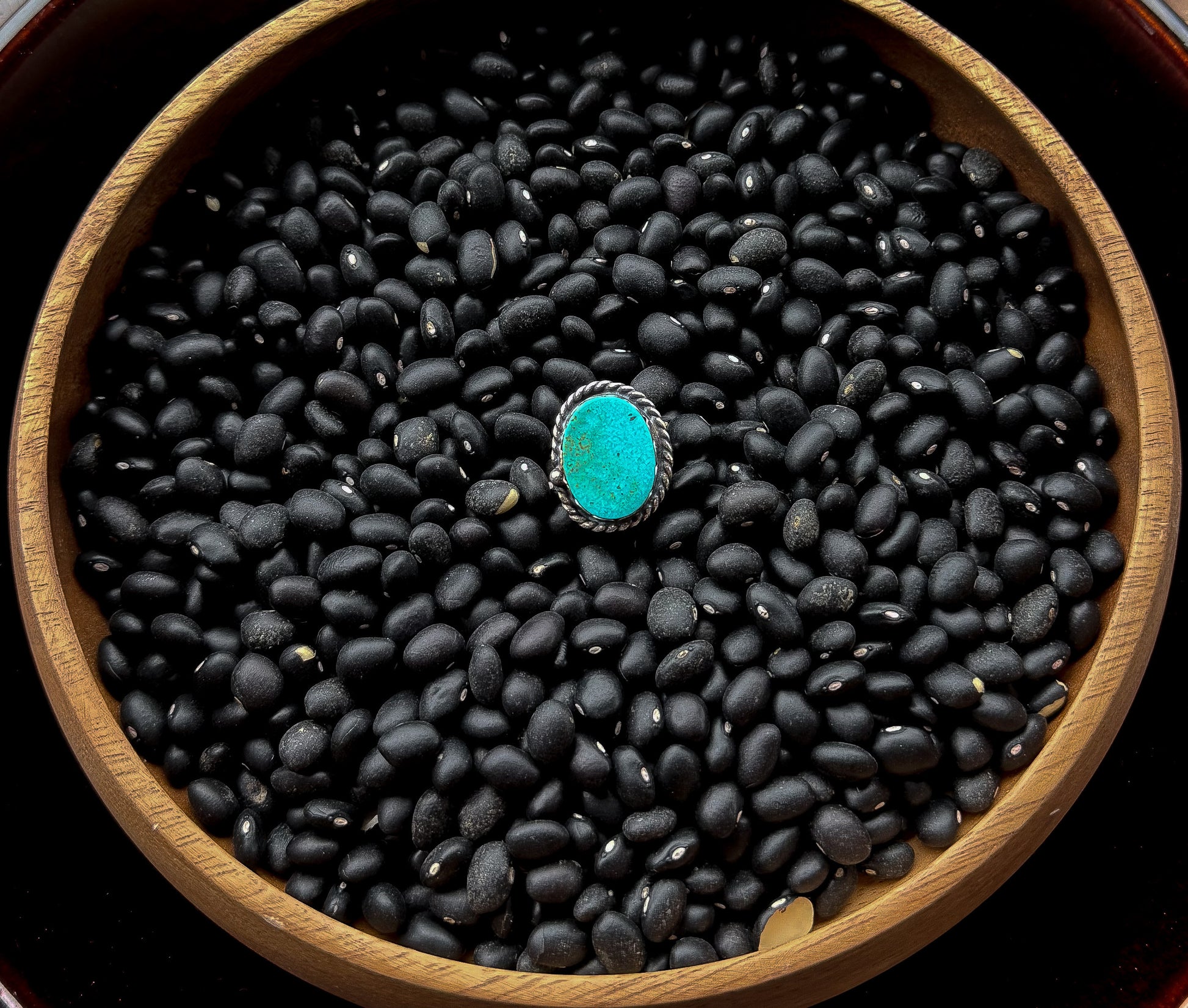 Size 8. Sterling Silver & Kingman Turquoise with plain band. Rope wire detail around stone.